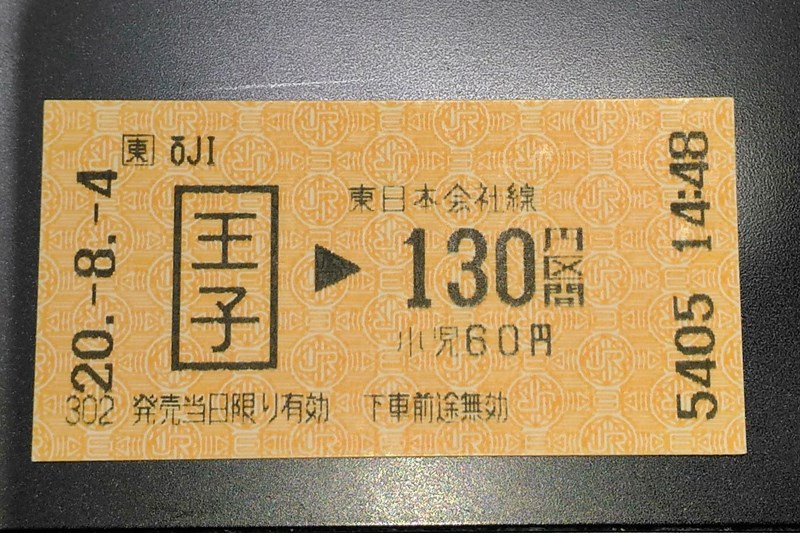 当初、東池袋駅からの乗車時に入場券を買い求めようとするも、発売していないことに気づき、最安区間きっぷ購入もやめて都電に乗り込んだようだ。次に下車した王子駅にて購入したのが、上の画像にあるJR王子駅130円区間の券売機券(いわゆるエドモンソン券)と、下の画像にある東京メトロ王子駅160円区間の券売機券であった。