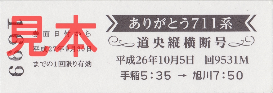 170円のD形硬券入場券。旭川駅で発売されていたのは、「ありがとう711系道央縦横断号」をデザインしたもの。