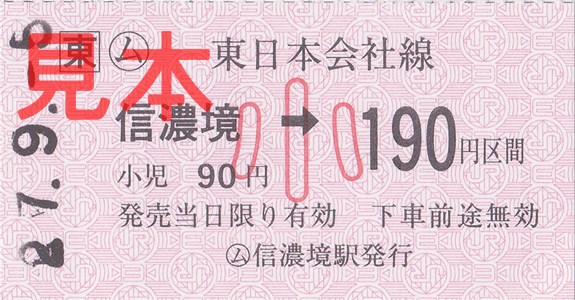 信濃境駅は中央本線(中央東線)において常備軟券を購入できる駅の一つとして切符収集家には知られている。しかし切符収集家諸氏のブログを拝見したところによれば、委託者が複数人で持ち回りで出札業務に就いており、乗車券の趣味購入の際、委託者によっては駅に備え付けの発行機から乗車駅証明書を取って車内あるいは下車駅で精算するよう言われてしまう例もあるという。今回はたまたま運良く趣味発券をしてくださったのだと思われるが、委託者によってはなかなか趣味購入が叶わないことがあるかもしれないというのはご承知いただきたい。