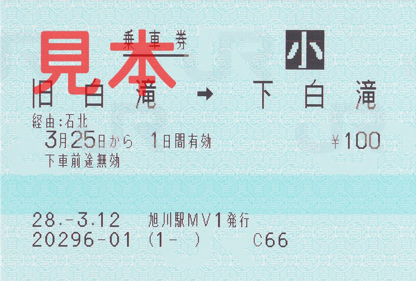 旧白滝→下白滝・片道乗車券(旭川駅指定席券売機発行・小児券)