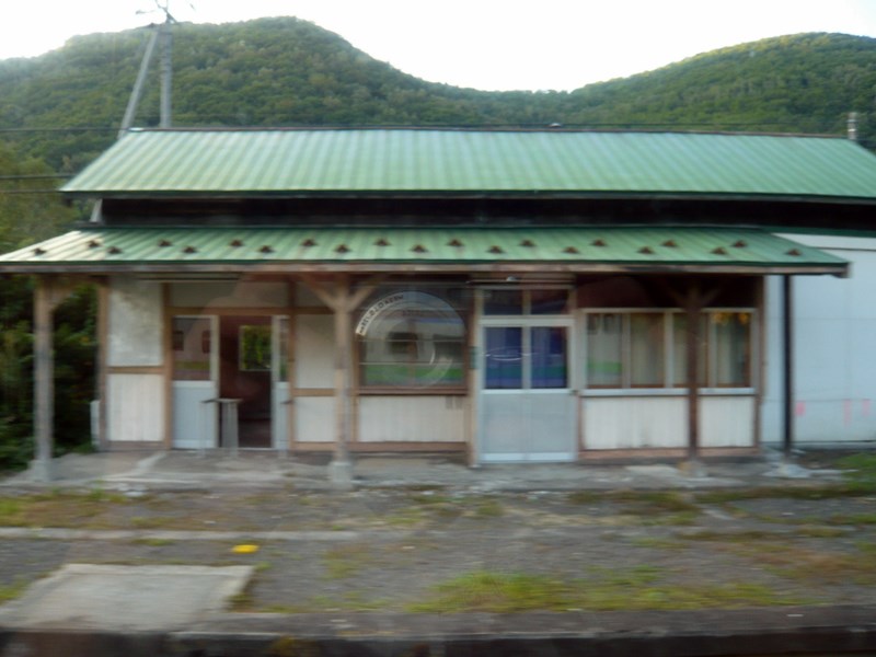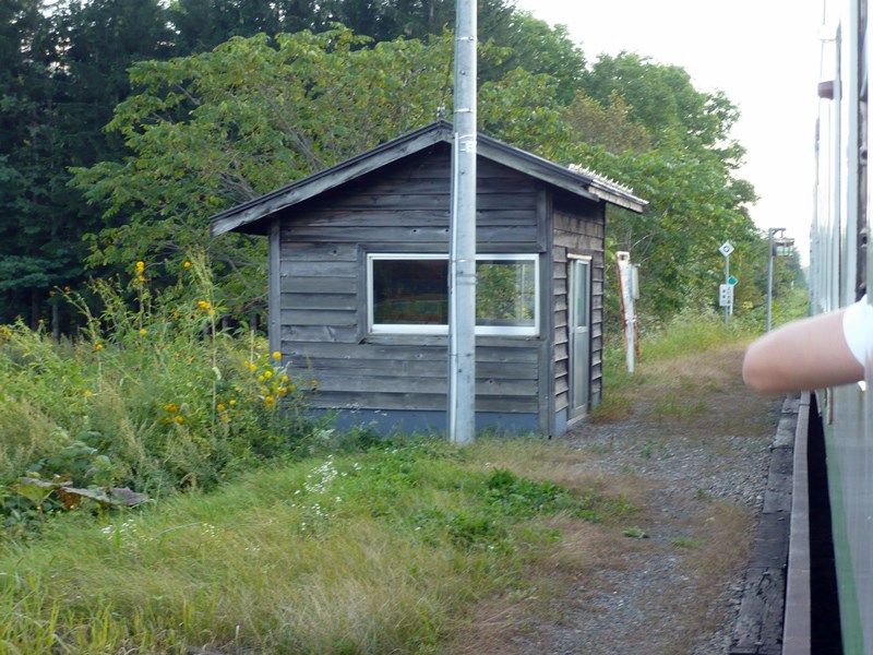 旭川行普通列車の車内から見た旧白滝駅の駅舎(