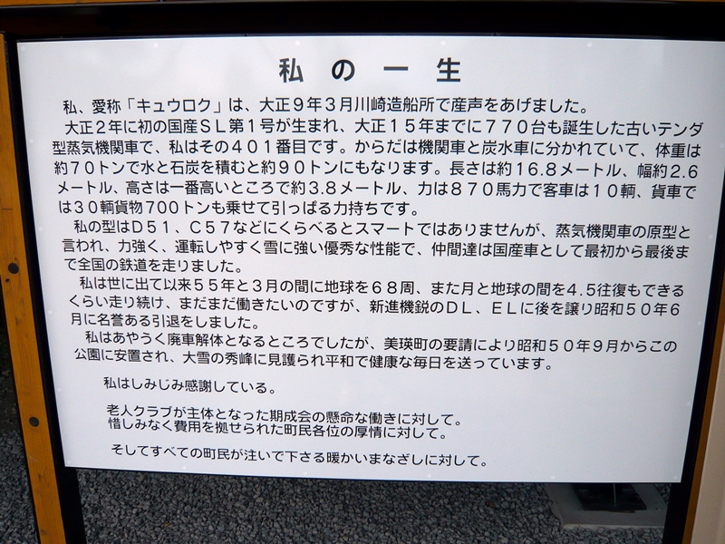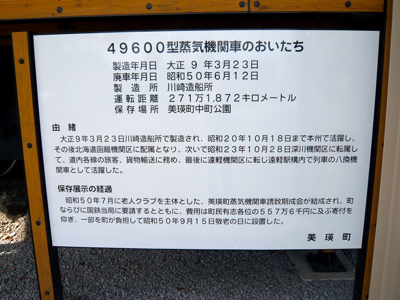 説明板には「49600型」とあるが、これは9600形と呼ばれる蒸気機関車のうちの1両だ。