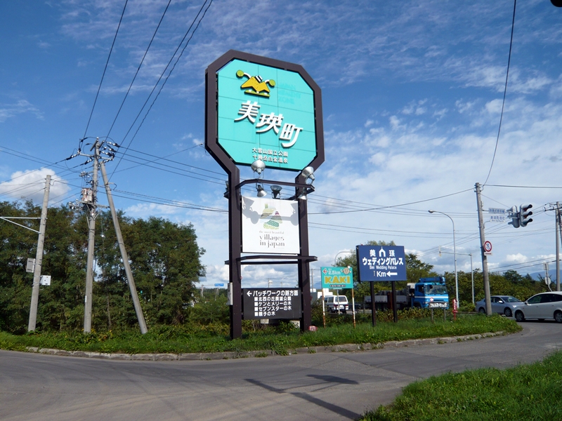 国道237号沿い、この看板の交差点を富良野方面から来て左に曲がると観光地として有名な丘陵地帯、パッチワークの路へ。北西の丘展望公園、ケンとメリーの木、セブンスターの木、親子の木などはこちら。