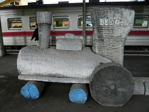 プラットホームには、丸太で出来た蒸気機関車が。どこまでも「森と匠の村」推しである。