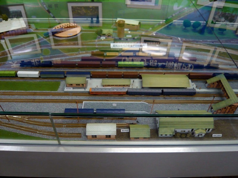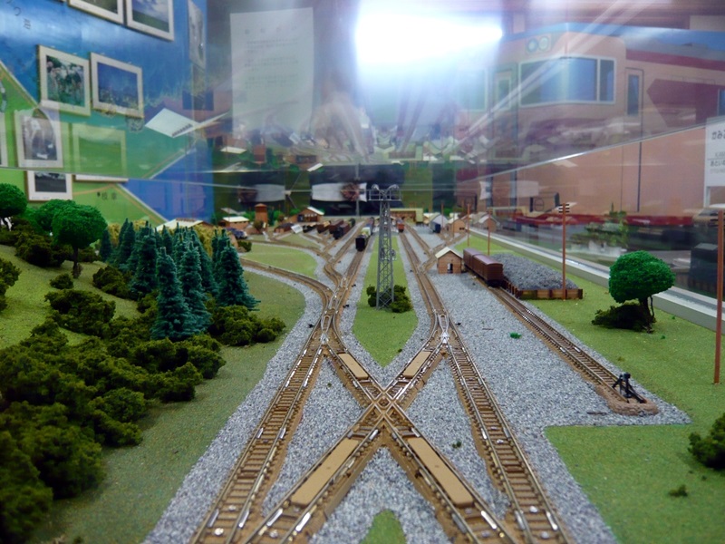 駅構内模型を駅前方向から見る。旧駅舎は側面が牧舎のような造りの、よくある国鉄駅といった趣き。