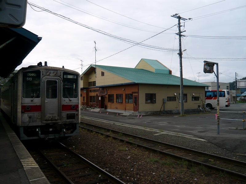 乗車列車のキハ54 513と音威子府駅舎。駅舎の影に尻を突き出しているのは宗谷バスの路線バス。