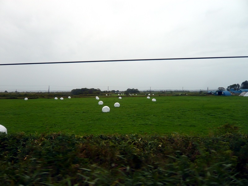 道道541号問寒別佐久停車場線の向こうに牧草ロールが点々と置かれているのが見える。