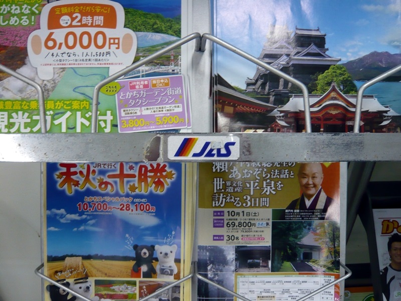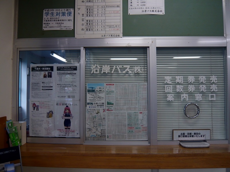 沿岸バスの幌延営業所窓口。訪問日は土休日なので閉鎖中。「萌えっ娘きっぷ」関連の掲示があるのが沿岸バスらしい。