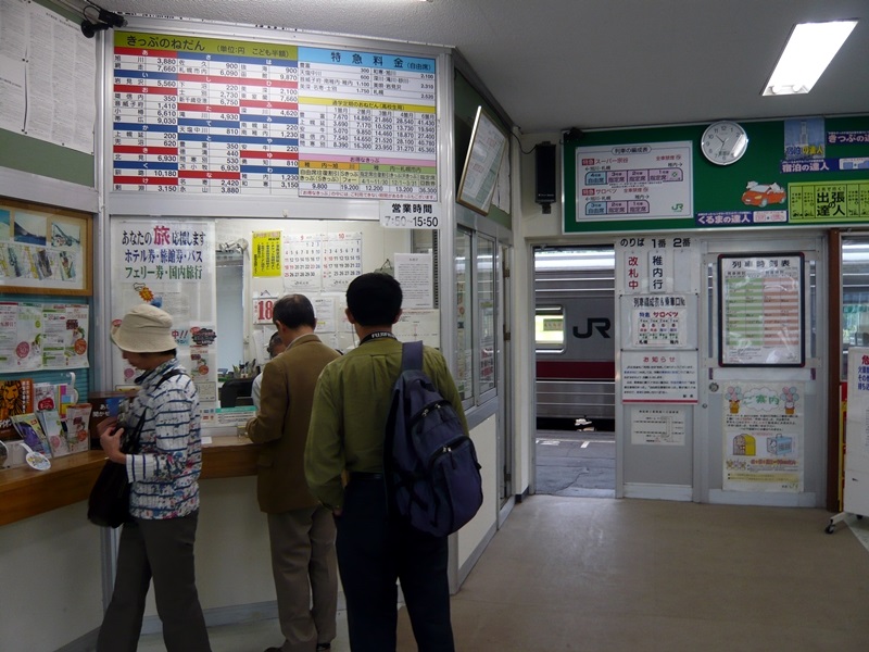 少し見切れているが、出札窓口横に宗谷本線のラッセル車の写真・運行ダイヤ等が掲出されていた。