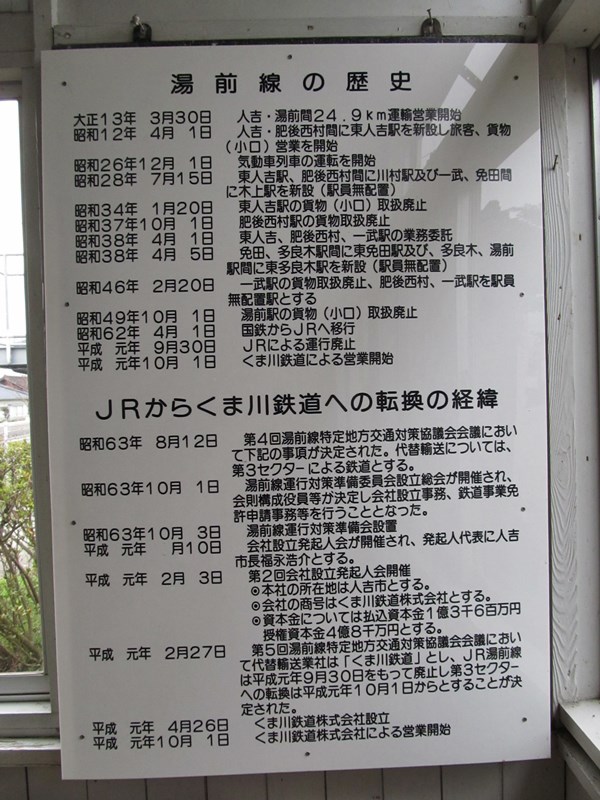 駅舎内に掲示された湯前線の歴史年表。