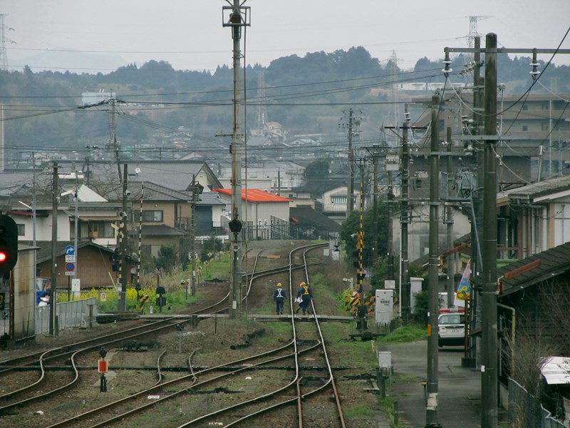 駅の八代方にある4種踏切から、車両基地や車庫、駅構内を望む。