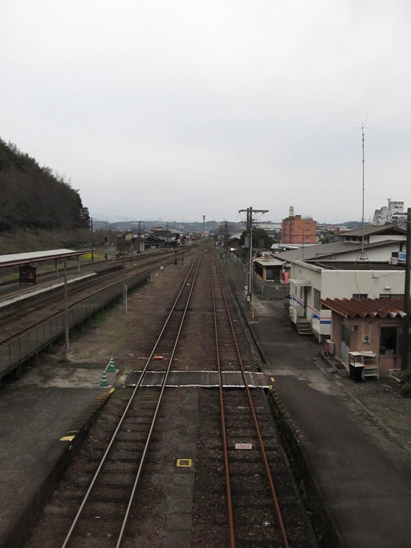 駅横のくま川鉄道ホームと駅裏手へ通じる跨線橋から、駅の東側を望む。