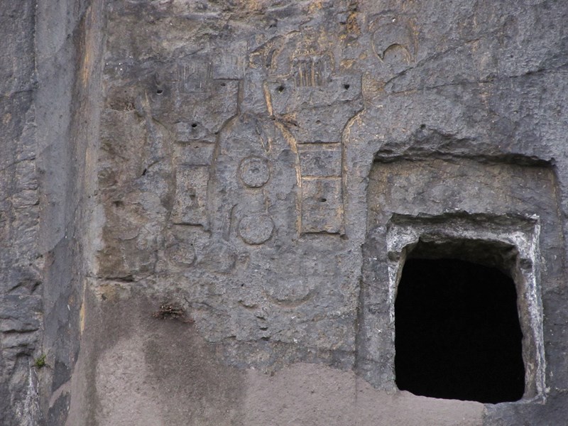 よくよく見てみると、これまた人為的に彫られたとみられる絵のようなものが見える。