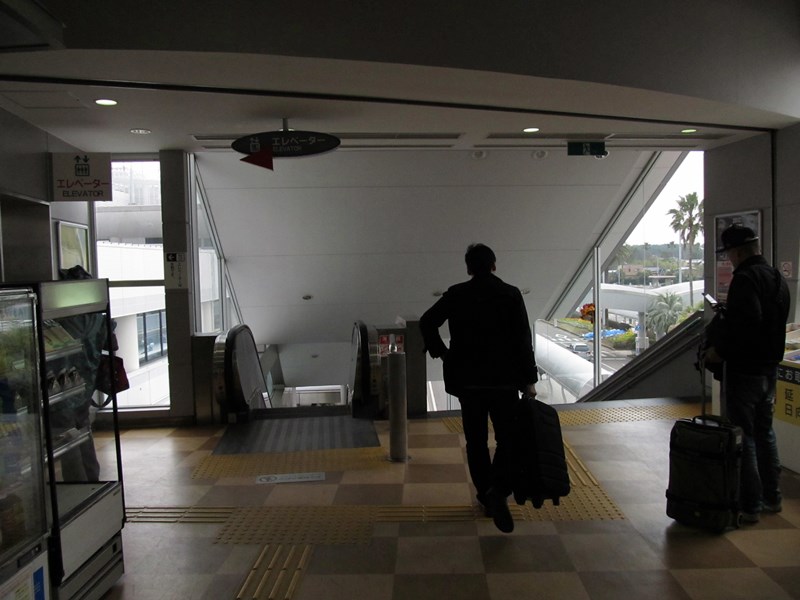 改札正面にあるこちらの階段を下ると宮崎空港のターミナルビルだ。