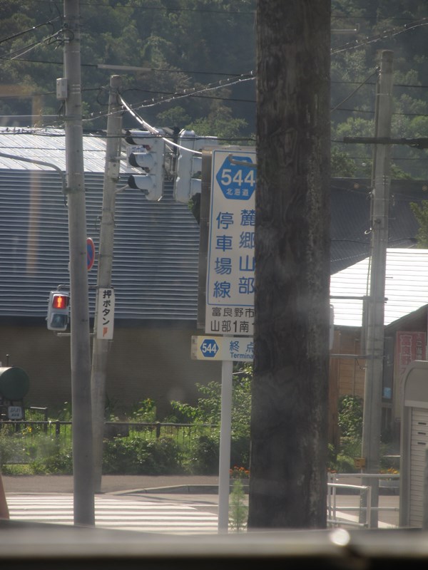 山部駅に停車中の車内から見えた道道544号麓郷山部停車場線の道道標識。
