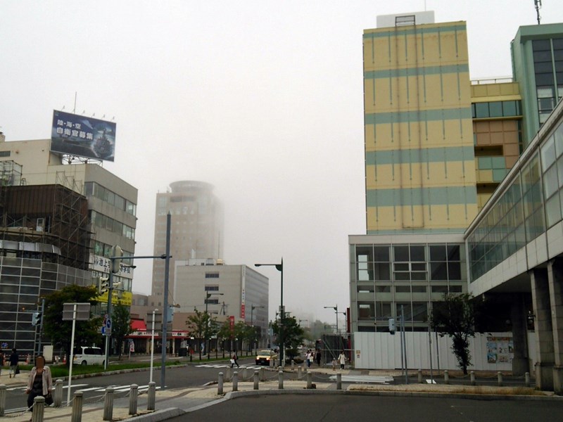 駅南口へ出てみると、数百m先は白い霧。