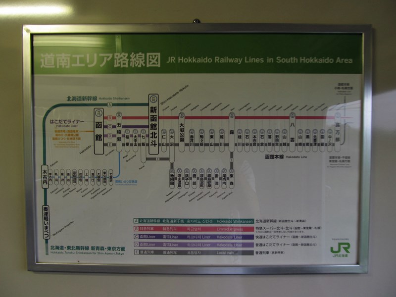 車内に掲示されていた道南エリア(JR北海道函館支社管内)の路線図。