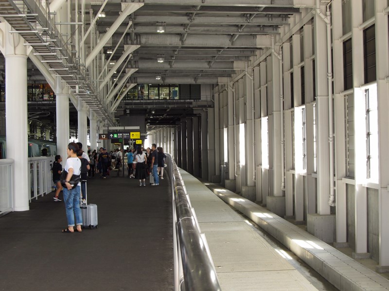 橋上駅舎の自由通路から新幹線ホームを見下ろす。