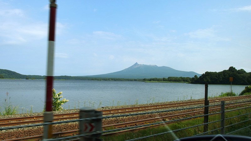 峠を越えると、函館本線の複線と小沼の向こうに駒ケ岳。