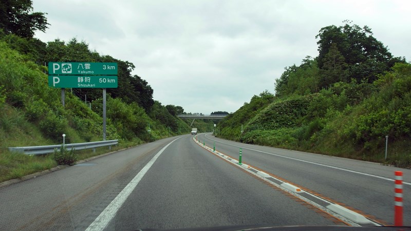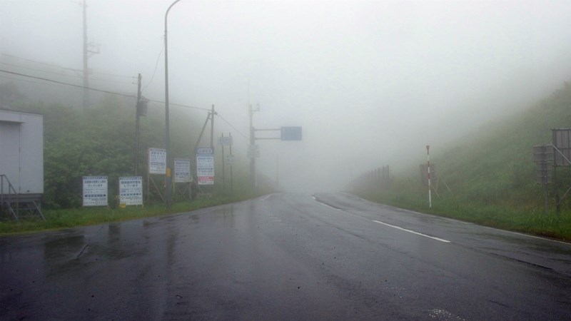雲石峠は霧の中。国道277号は道内の国道としてはあまり線形や道幅が良好とは言えないところもあり、八雲町内の重要な幹線道路として雲石道路として改良事業が進められている。