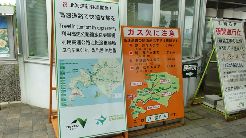 道内の給油施設はこの4箇所しかない。特に道東方面は池田ICまで有料区間であるにもかかわらず、札幌近郊の由仁PAが最後の給油施設となってしまう。そのためこのような警告がなされているものと思われる。